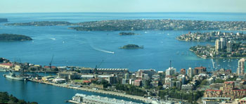 Sydney Harbor, also known as Port Jackson, is located on Australia's south-east coast along the Tasman Sea. Sydney Harbor, is the largest natural harbor in the world, bordered by the Pacific Ocean to the East, the Blue Mountains to the West, the Hawkesbury River to the North and the Royal National Park to the South. The port area has a moderate climate, with warm summers and mild winters due to its proximity to the ocean. The city is built on hills surrounding the harbor.